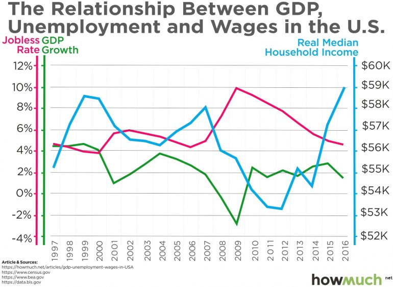 從網路財經雜誌The Balance中的GDP、失業率和收入中位數有關的數據,該數據來源為美國政府各辦公室。調查結果先考慮通貨膨脹來調整中位數收入變成實際收入,以便能在不同的年份進行真正的比較。並在圖上繪製了從1997年以來每年的數字,顯示出20年來的經濟面貌。