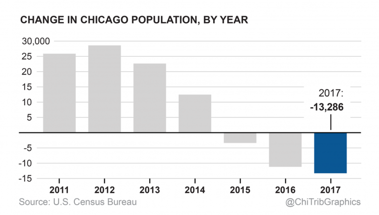 根據美國人口普查局周四所公布 2017 年的數據資料,發現南邊及西邊眾多城市人口皆增長的同時,大芝加哥區連續第三年人口減少,估計有 13,286 人從芝加哥都會區搬離,芝加哥市在 2016 年減少了 11,177 人,2015 年時減少了 3,371 人。