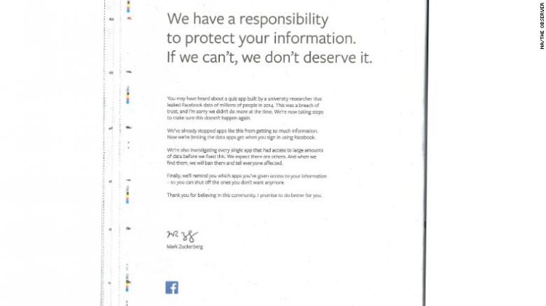 在廣告中祖克柏說,「你可能聽說過,在 2014 年一位研究員建造了一個測驗軟體,因此洩露了幾百萬人的臉書個人資訊。這違反了用戶對我們的信任,我非常抱歉我們在那時沒有做得更多。現在我們會作出行動確保不再發生這種事。」這個廣告在好幾家英國和美國報紙上出現:英國的「觀察家報」(The Observer)、「星期天時報」( The Sunday Times)、「週日郵報」(Mail on Sunday)、「週日鏡報」(Sunday Mirror)、「週日快報」(Sunday Express)和「週日電訊報」(Sunday Express );美國的紐約時報、華盛頓郵報,和華爾街日報。