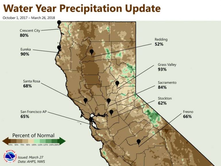 三月的三個星期內,Sierra的高海拔地區超過15英尺的積雪,Sierra的含水量在一個月內增加了三倍。專家表示,儘管冬季時並沒有爆發一定的雨量和雪量使該州達到平均水平的降雨量和漾水量,但是,三月降水量舒緩了未來一年出現乾旱,尤其是北方。