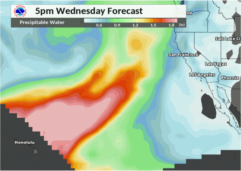 風暴的前沿目前距離海岸大約1000英里,可以通過夏威夷上空橫跨中太平洋的衛星圖像看到。預計到星期六,北灣的降雨量將降至3至6英寸;索諾瑪縣的聖羅莎和克洛弗代爾以及馬林縣的肯特菲爾德的降雨量最大。聖拉斐爾預計降水多達4英寸;在納帕、半月灣和聖克魯斯3英寸;在舊金山和康科德兩英寸。