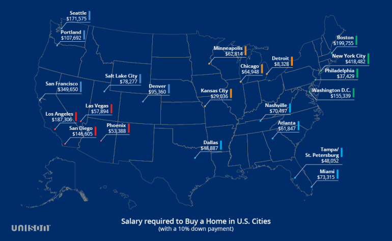 下面就來仔細看看在十一個美國主要城市中,你一年需要賺多少錢才能買得起房。