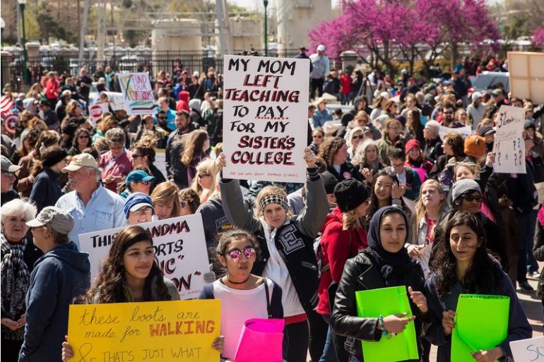 四月 2 日開始,上千名奧克拉荷馬州的老師長途跋涉到議會大廈,要求議員分配更多稅金到學校與課堂中,許多奧克拉荷馬州的學區都大受影響。