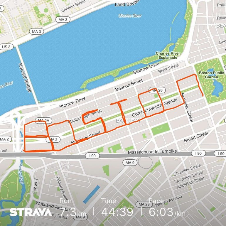 五年前,波士頓馬拉松發生了死亡炸彈攻擊,今年波士頓人在這個星期天再度舉辦了一場馬拉松,若從天上往下看,路線就像拼出了波士頓的名字。