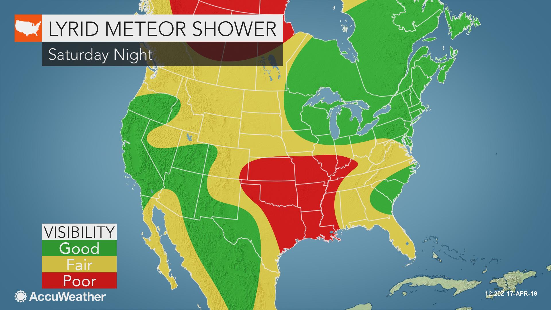 根據這個地圖,觀測天琴座流星雨的最佳地區從東岸的賓州到緬因,和西岸的亞利桑那州、新墨西哥州、內華達州、華盛頓州、加州和德州一部份地區。