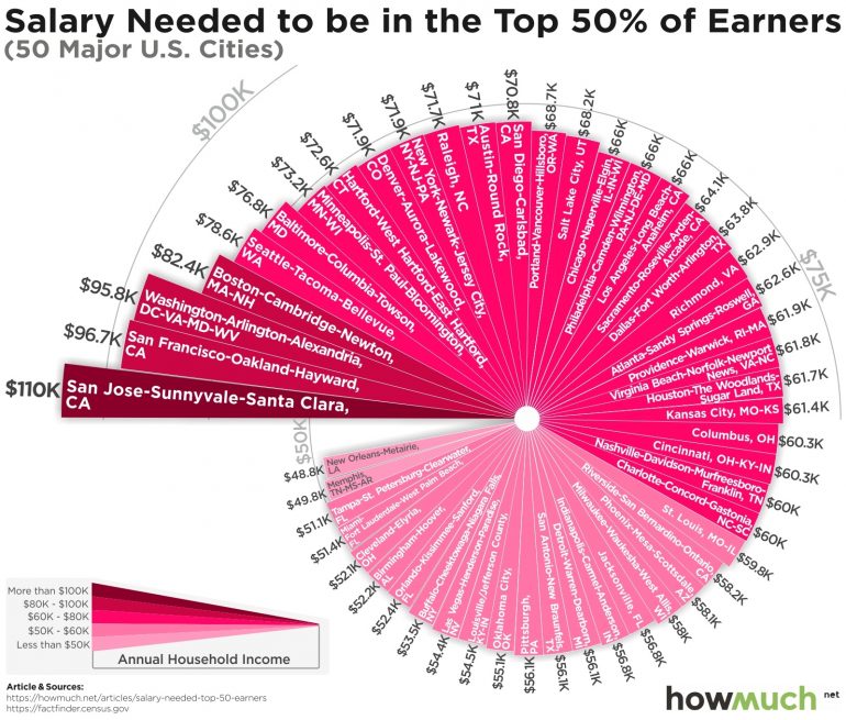 從美國人口普查局蒐集了2016年前50個人口最多的城市中,各地區的年平均家庭收入數據。在這最新的一年數據中,將每個城市繪製在爆炸式餅圖上,可以讓你快速而輕鬆地看到你的家庭需要賺多少錢,才能進入你所在地區的前50%收入群。