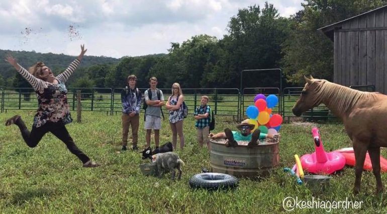 Keshia Gardner 已經拍了好幾年歡慶開學的照片,今年的他決定讓她的丈夫 Andy 和阿拉巴馬農場的動物一起入鏡,並且表示這個派對是要跟孩子們一起慶祝他們即將回到學校了。