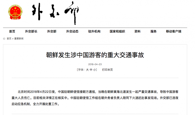 中國外交部證實,北韓黃河北道區域在星期日晚間發生了大型車禍,中國遊客有「重大人員傷亡」。發言人陸慷在回答媒體提問時,更說明了有三十二位中國遊客和四位北韓民眾在此事故中身亡。