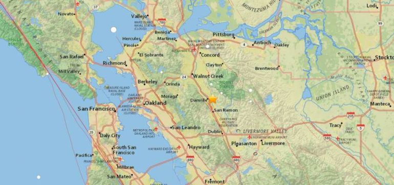 星期天下午,美國地質調查局(USGS) 報告在加州Danville附近發生規模3地震。