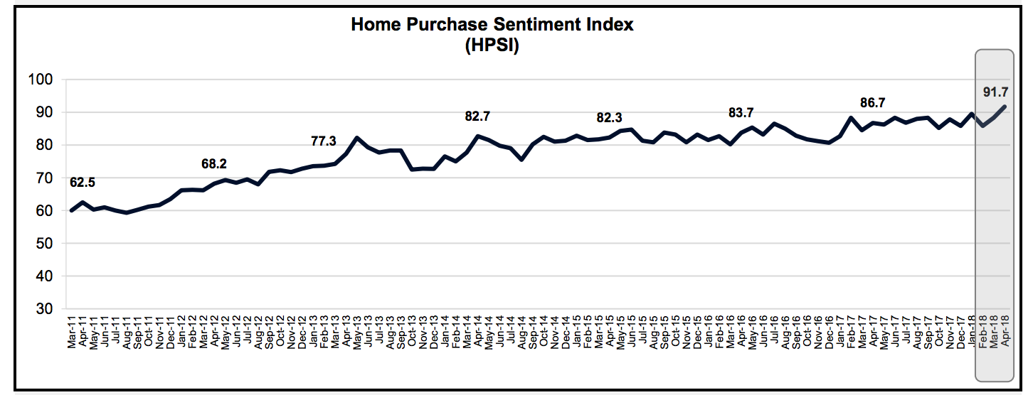 HPSI 4月份上漲3.4點至91.7,自2017年4月以來上漲5個百分點,突破了上一期高點89.5。儘管淨股份下降3% ,受訪者表示現在仍是買房的好時機。