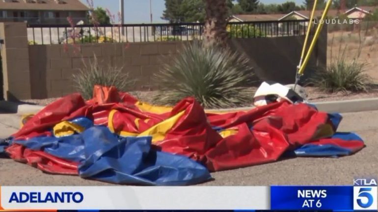 星期六下午,一位加州阿德蘭托市(Adelanto)的九歲男孩在家中前院的充氣屋(bounce house)玩時,一陣強風將整個充氣屋吹到僅僅一兩百公尺外的 395 號高速公路上。這時,充氣屋撞上一台車,男孩就從充氣屋中滾出來。幸運的是,車流立即停止,男孩身上也只有輕微擦傷。警方認為男孩「非常幸運」。