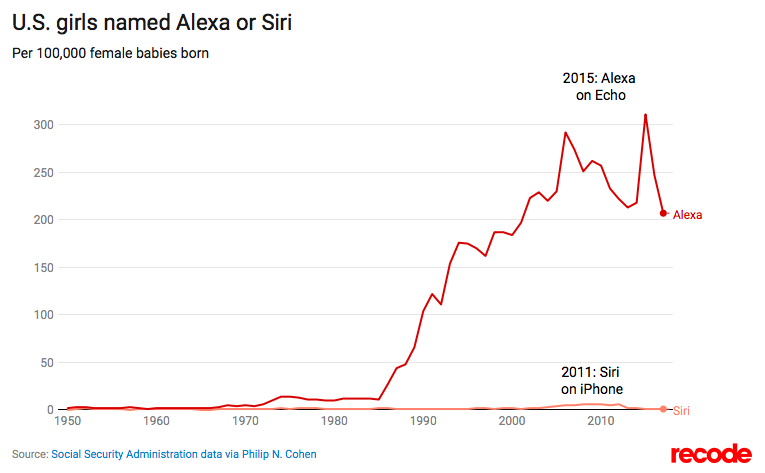 亞馬遜在 2015 年開始擴大販賣作為語音助理的智能喇叭 Alexa。那一年,美國有 6,050 個女嬰兒被命名為 Alexa。但從那之後開始,Alexa 這個名字就變得越來越不受歡迎。根據社會保障管理局(Social Security Administration)的資料顯示,名叫 Alexa 的嬰兒總數下降了 33%,去年只有 3,883 個小孩名叫 Alexa。