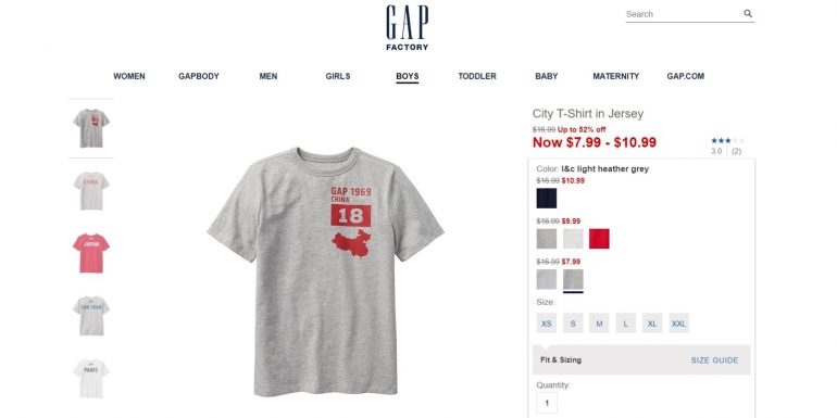 這件 T 恤上繪製了一個中國地圖,根據 Business Insider 的發現,截至他們在撰寫本篇文章時,仍然可以在 GAP FACTORY 的網站上,看到他們以 7.99 美元販售這件「中國地圖T恤」,而這件 T 恤也在網路上引起一陣軒然大波,原因在於這個地圖上省略了藏南地區、台灣以及南海上的一座島。