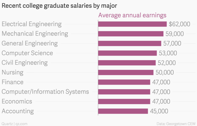 根據該中心的在大學畢業生工作場所的報告中,如果你想大學畢業直接進入就業市場,又就讀工程師相關,那絕對是一條可行之路。以下是最近各主修的大學畢業生工資排名: