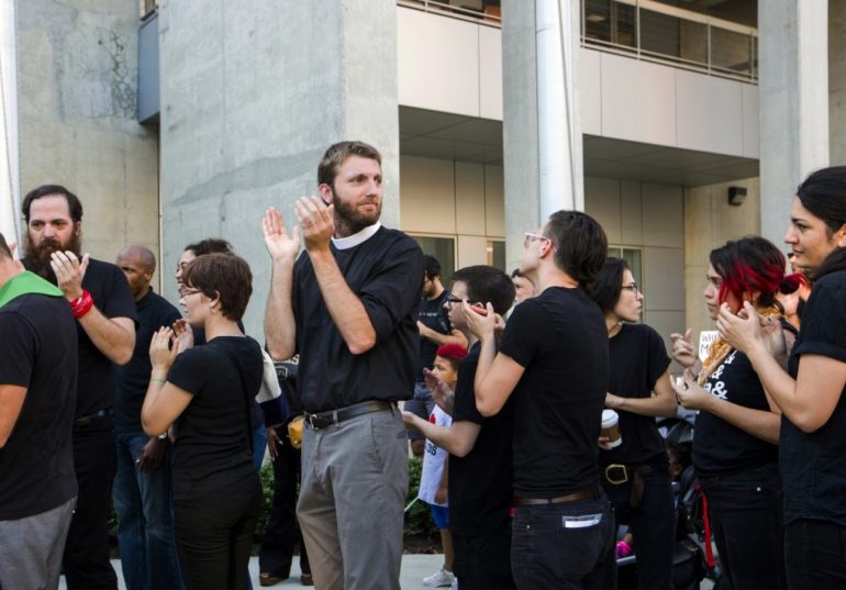 在北卡羅納的德罕(Durham),星期四有一大群人們在警察局前排隊,要「自首」惡意破壞南方邦聯的雕像,該雕像是在上週被拉倒的。