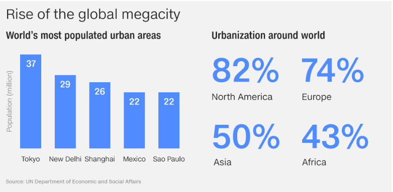 這個成長的主要原因是,越來越多人從鄉村移居到城市中,尤其是在亞洲。儘管亞洲有一些世界上最大的城市,在整體城市化的速度還是比世界上其他地方緩慢。在亞洲,差不多有一半的人住在城市裡,北美洲有 82% 的人,歐洲則有 74%。 非洲是最少人住在城市的州,只有 43% 的人住在城市裡。這將會改變,據報告預測,在 2018 年到 2050 年,印度、中國和奈及利亞將會佔城市人口的預期成長的 35%。於是在 2050 年,聯合國預測印度會增加四億一千六百萬個城市住民,中國會增加兩億五千五百萬,奈及利亞一億八千九百萬。