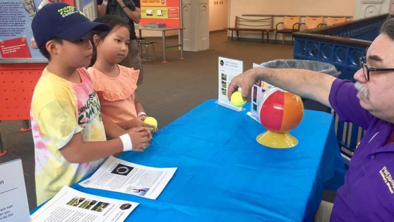星期日在馬里蘭州巴爾的摩的兒童博物館 Port Discovery 舉辦了日蝕的主題活動,許多家長帶著孩子們一起來參加。博物館的社區發展工作人員 Barbara Henschel 表示,Port Discovery 時常會舉辦呼應這個世界發生了什麼事情的活動,像這次的 「大月亮,小月亮」(Big Moon, Little Moon)的活動,便是以沙灘排球及網球來展示為什麼在日蝕期間,月亮及太陽的大小會是一樣的。