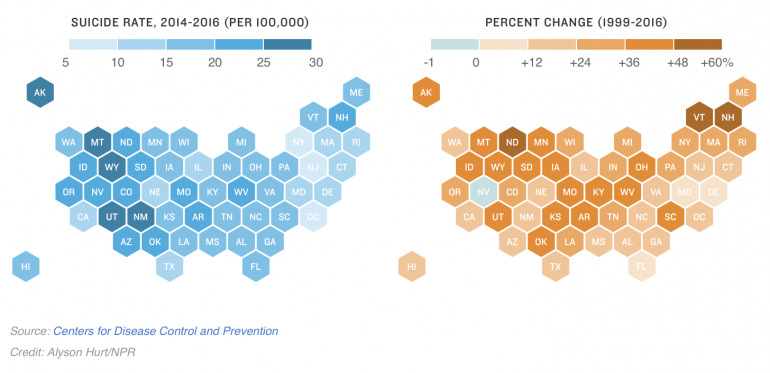 疾管局(CDC)搜集了1999年至2016年的自殺數據,並進一步檢視。光是2016年就有將近4萬5千人自殺死亡。研究發現,在過去20年間,幾乎美國每一州的自殺率都上升,其中一半的州甚至增加了3成自殺率。