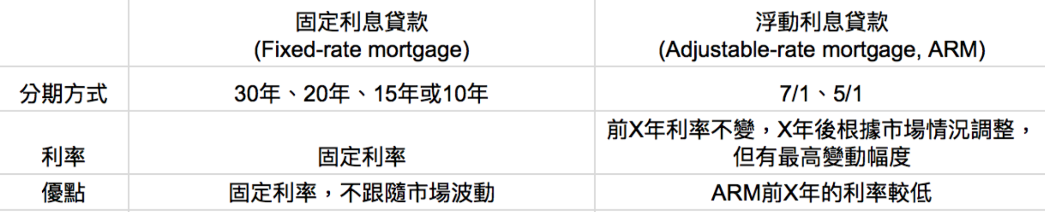 在美國借房貸比較容易,利率也比較低。美國房貸分為兩種:固定利息貸款(Fixed-rate mortgage)和浮動利息貸款 (Adjustable-rate mortgage, ARM)。以下是兩個的簡介: