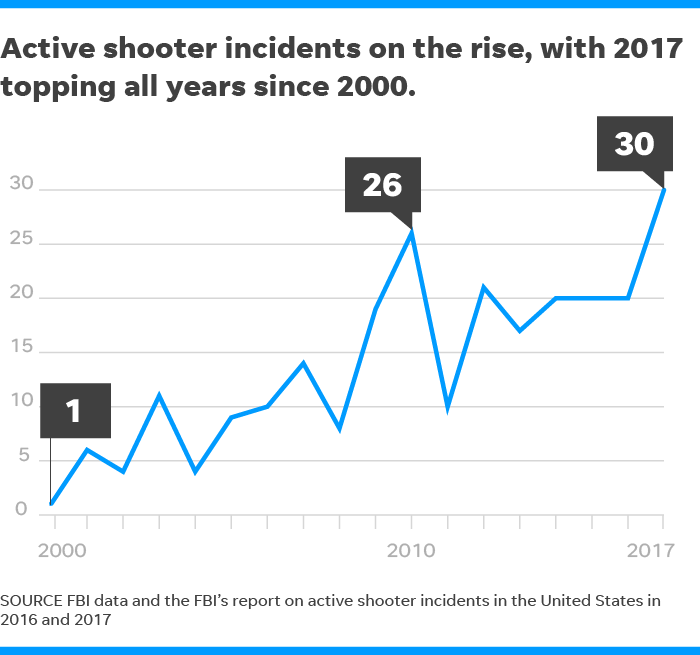 頻繁的槍擊事件繼續困擾著美國,但去年全美發生了30起事件 ——這是自FBI開始追蹤此一現像以來的最高數字。去年也創下了單年最高死亡人數的紀錄。