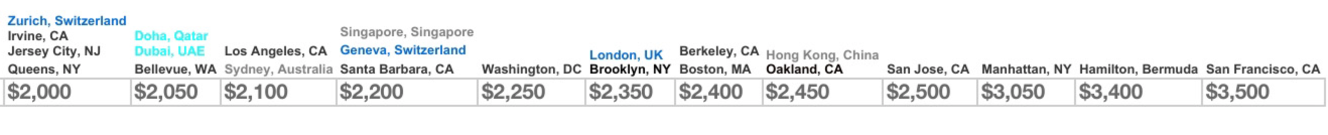 根據財務諮詢網站Wallet Wyse的執行長Aaron Ansel所發布的最新發布的圖表,Ansel使用生活費統計網站Numbeo的數據,對全球540個城市的平均租金進行排名,從最低到最高,按地區進行顏色編碼。舊金山飆升至排名最高處,平均租金為3,500美元,而Bermuda的Hamilton以3,400美元排名第二,紐約曼哈頓以3,050美元排名第三,聖荷西以2,500美元排名第四,加州Oakland與香港同列第五。