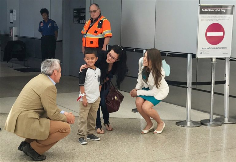 當他的視線掃過左側一排的椅子時,他的母親—24歲的 Yolany Padilla 朝著他走來。從進入美國時就被拆散的他們,到現在已經分開兩個月了。