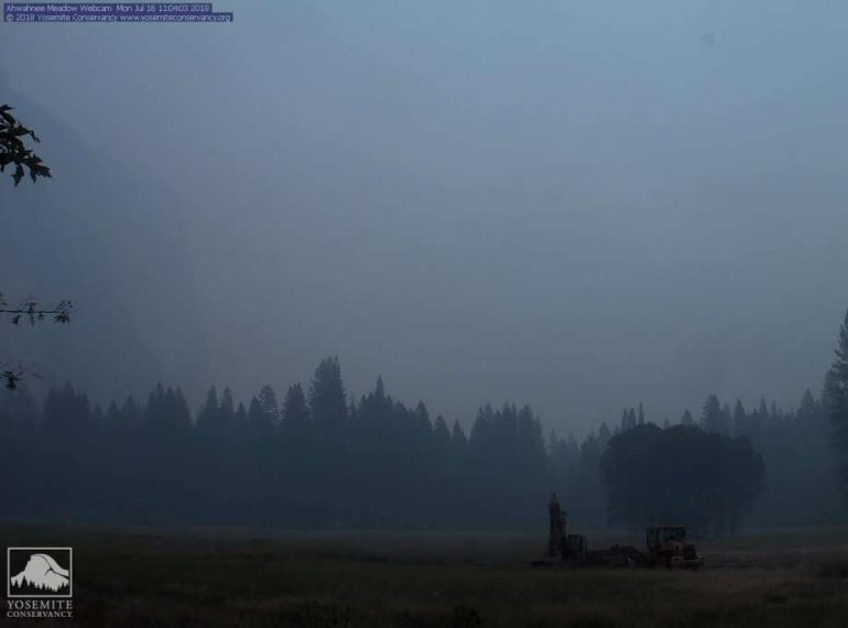 週一,由於Yosemite 國家公園西邊的Ferguson Fire 肆虐,煙霧籠罩整個公園,公園內的空氣品質已到達危害健康的水平。