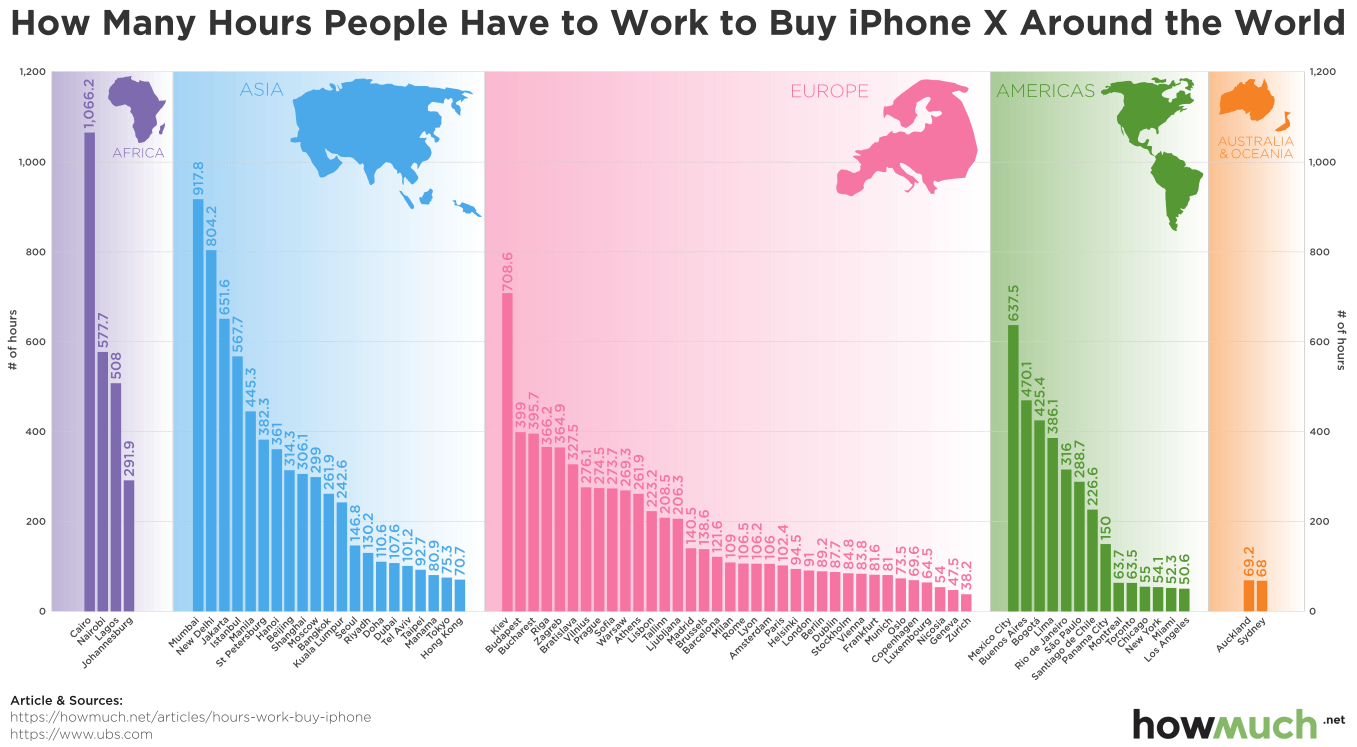 該圖有趣的是,這不只是區別國與國之間的不平等,也同時區別的各州內的不平等。舉例來說,歐洲的左半邊比右半邊花更少的工作時數就能買到iPhone X;同樣地,在北美如洛杉磯工作,會比在南美洲的阿根廷 Lima and Buenos Aires 花更少工作時間買到iPhone X。
