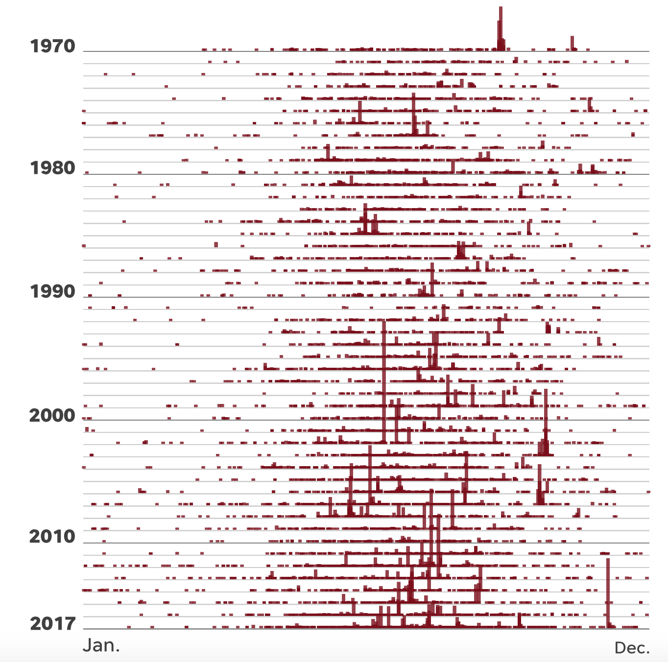 從歷年圖表上顯示,從1970年到2017年,縱軸顯示時間,橫軸顯示1月至12月,而紅色數據上的高度,則表示火災規模大小。