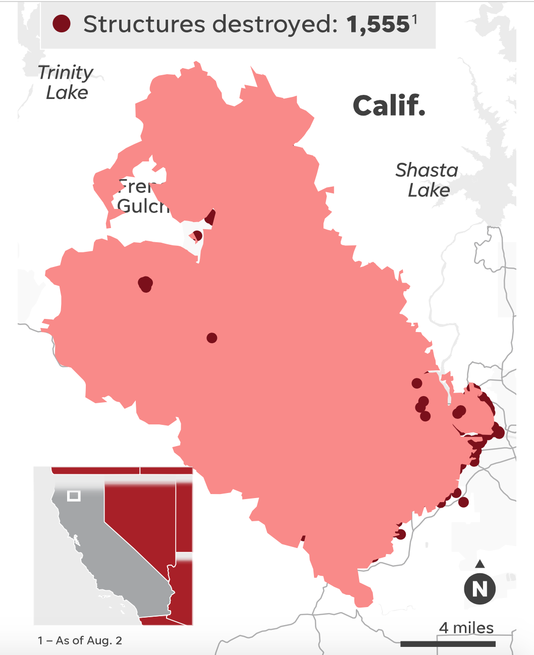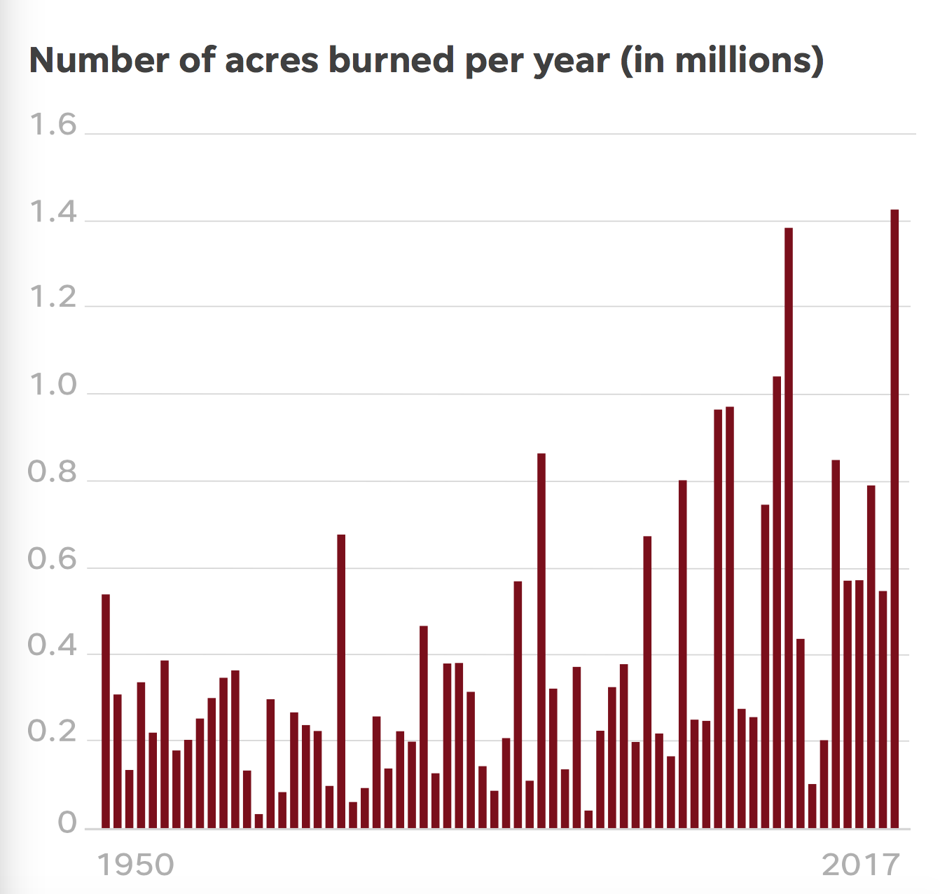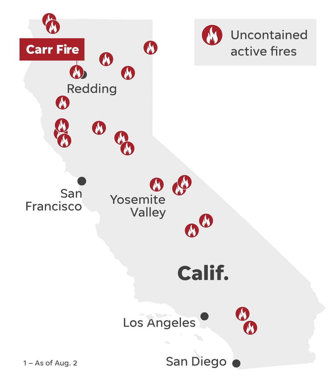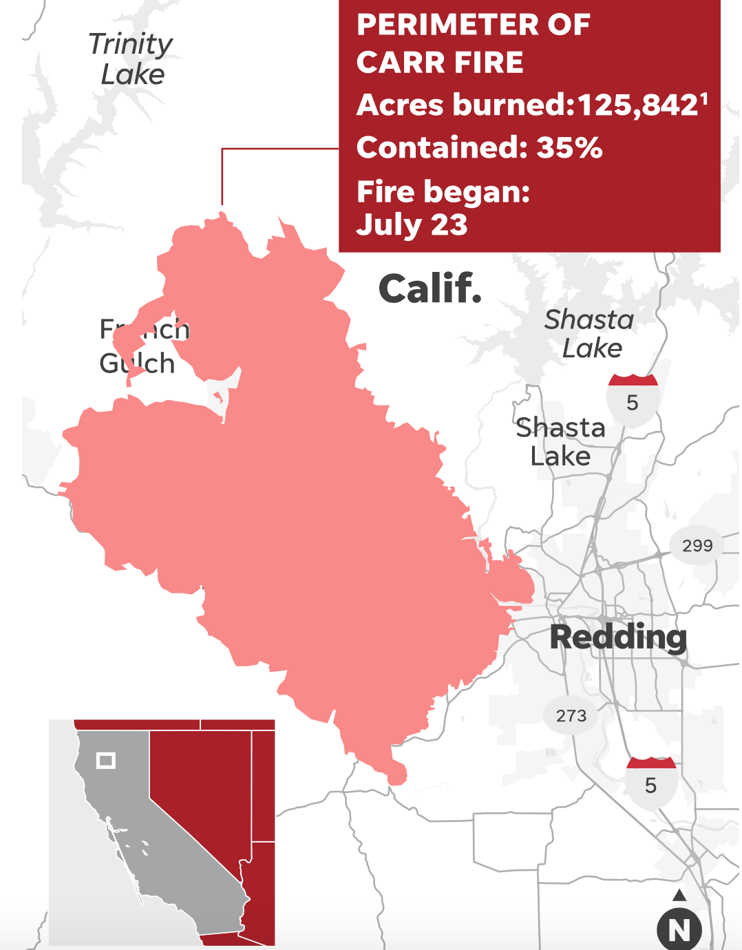 該州最具破壞力的前十場火災,其中有5場在過去4年內發生。而在北加州的Carr Fire,則是近十年大規模火災中最嚴重的一場。6人死亡,超過1000棟住家遭受摧毀,從Shasta County以無法預測的速度前進。超過39,000人遭到驅離,數千人等待回家。