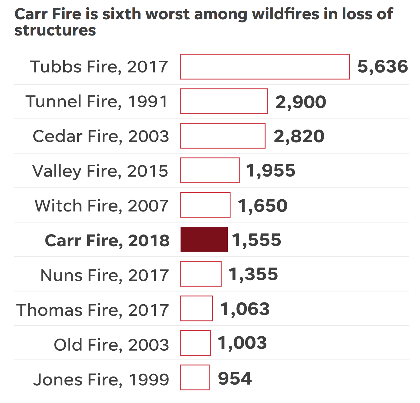 商業開發在火災風險高的地方開發房屋,使得野火更易發生、更危險。因為車輛故障所發生的Carr Fire,現在是加州第六大嚴重的火災。