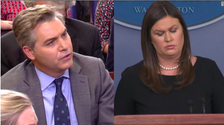 Acosta 剛從坦帕的川普集會回來,媒體被那裡的民眾不停地譴責,他無法接受桑德斯的答案,「你並沒有在剛剛的話裡說媒體不是『人民的敵人』。我們每個人都被強迫要聽別人批評我們、每個人都被迫要被噁心地怒罵,你不是例外,而我很抱歉這發生在你身上,我希望那從沒有發生。但至少為了這間房間裡的人、民主、這個國家、世界上所有在看美國的人,美國白宮、美國總統不應該說媒體是『人民的敵人』。他自己的女兒都這麼認為了,我只是想請你也在此時此地這麼說而已。」