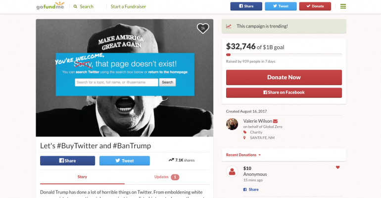 前CIA探員Valerie Plame Wilson號召一項活動,希望可以籌募資金來買下Twitter的少數股東權益,進而關閉川普在Twitter上的帳號。 她開啟一個叫GoFundMe的網頁,並且說明:Twitter是一個上市公司,所以權利=股份。這個網站會募集資金來買下Twitter的股東權益。