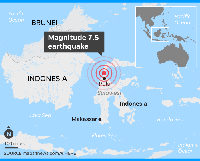 在地震和海嘯的雙重襲擊後,印尼的總死亡人數目前已經攀升到832人,許多房屋都被沖毀。最多死傷的城市是帕魯(Palu)。有很多心碎的家庭們在帕魯街上的黃藍屍袋裡尋找自己親愛的家人。擁有38萬人口的帕魯因為是沿著一個狹窄的海灣所建造的,所以更加強了海嘯襲擊時的威力。海嘯巨浪在某些地方據報達到了20英尺之高。