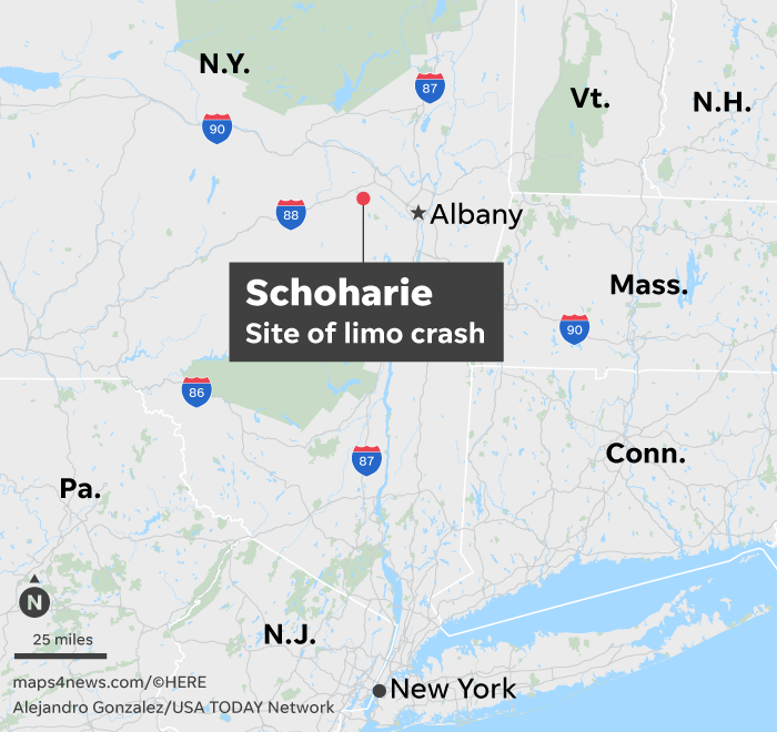 警局發言人 Christopher Fiore表示大型豪華轎車沒有成功停在Schoharie城鎮的交叉口,並且撞上一台停在那邊、沒人在裡面的SUV。18人在大型轎車裡面,包括司機,而路邊有兩位路人也遭撞死。「在豪華轎車裡的人無一倖免,皆身亡。」Fiore說。