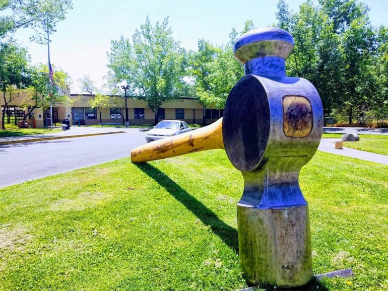 北加州的警方正在尋找一個在社區中心外失竊的巨大鐵鎚藝術品。