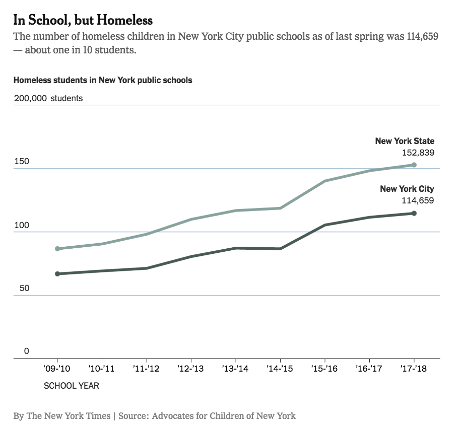 在過去八年內,無家可歸學齡孩童的數量急劇增加。去年春天的總計數量已經達到114,659人,比起2010年的69,244人整個大幅上升。目前紐約市公共學校的孩童人口大約為110萬人。也就是說,大約10%的紐約市公共學校學童是無家可歸的。