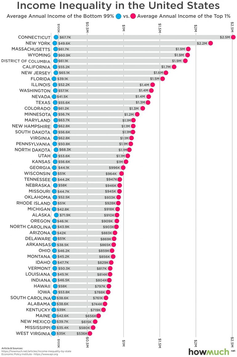 為什麼這世界有這麼不平等?幾代以來的經濟學家都試圖解決這個問題。我們的圖像中,描繪各州前面1%收入者與剩下99%收入的人。