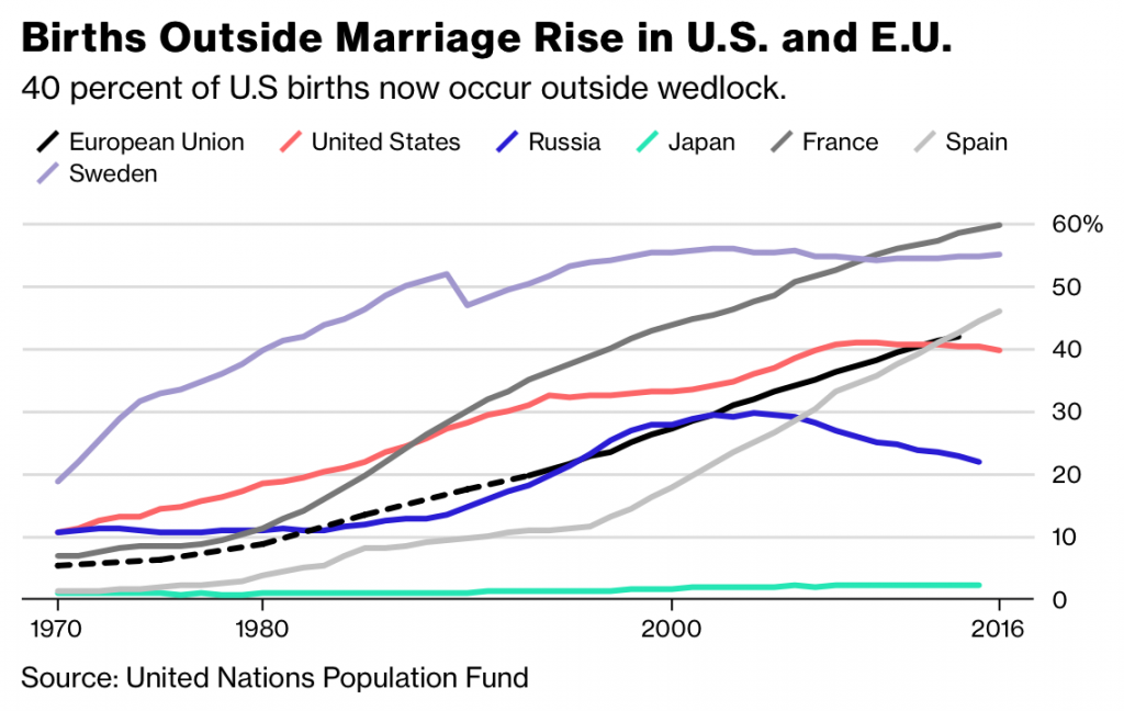 數據顯示,在美國和歐盟國家的未婚生子,多發生在未結婚的同居情侶,而非單親媽媽。這可能意味著,社會和信仰的常規,對於婚姻、孩童撫養、工作場域的女性等等正在改變。