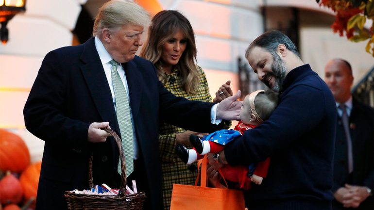 總統川普和第一夫人梅蘭尼亞在白宮的南草坪舉行萬聖節活動,向孩子們贈送糖果。