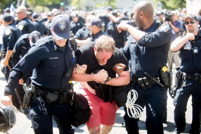 一群無政府主義者穿著全身黑的服裝、帶著面具,向Berkeley 公園周圍的右翼示威者抗議。有時抗議者竟壓倒了一大批警察。