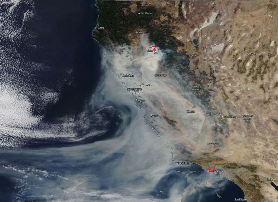 NASA地球觀察系統資料與資訊系統採用高解晰度的地球衛星圖像,在11月10日拍攝加州的照片中,加州整個州都覆蓋上一層薄薄的棕色煙霧。