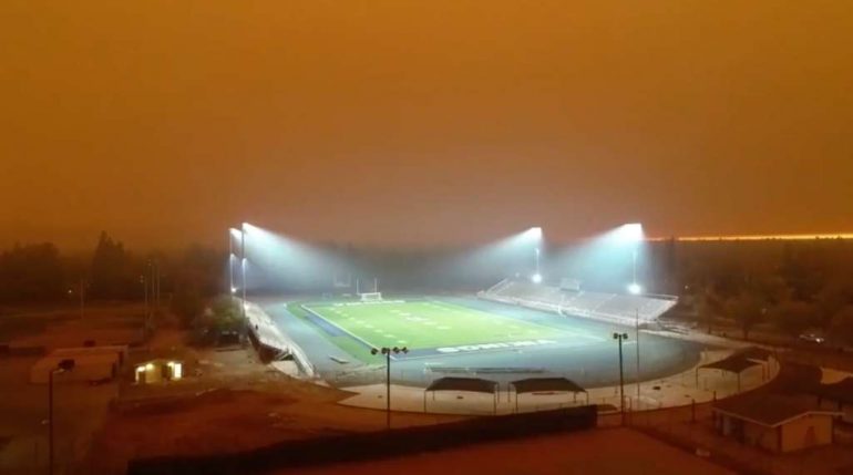這幅景象看起來像在火星,然而,卻是加州Chico的高中田徑場。一名加州居民用無人機畫面拍下濃霧瀰漫、橙色天空和沈重的煙,陰霾籠罩著的環境。