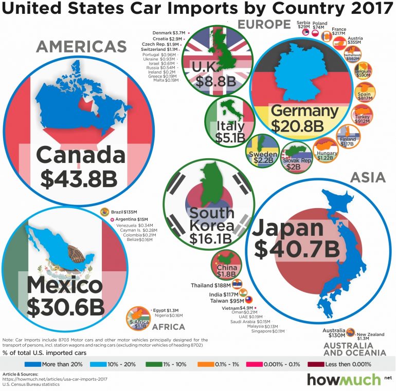 圖表上的大多數國家都是大型經濟體的國家,因此可以製造和出口到美國高品質的汽車。墨西哥則一例外,因為北美自由貿易協定和美國汽車製造商的存在,才能夠將車輛出口到美國。以高品質汽車聞名的日本汽車進口價值第二,達到$407億美元。 從總體上看,2017年來自歐盟的汽車進口總額約為$433億美元($374億歐元),幾乎與加拿大相同。
