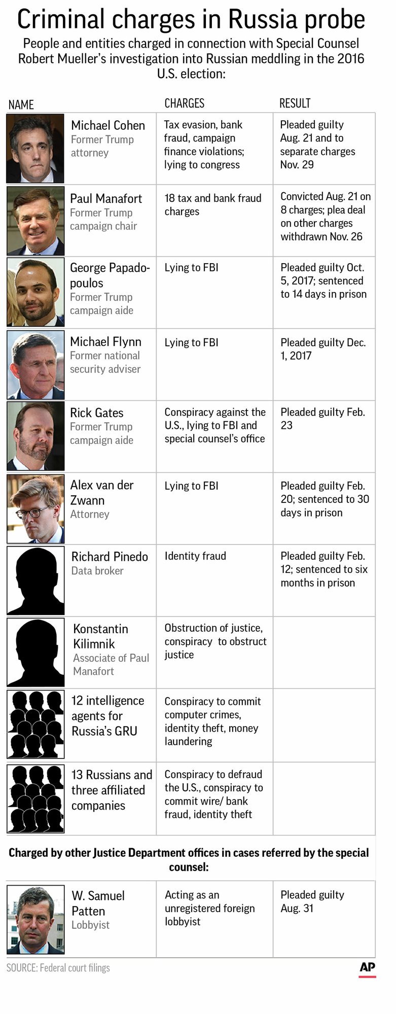 以下這張表為和通俄門事件相關調查有關且被起訴的人員: