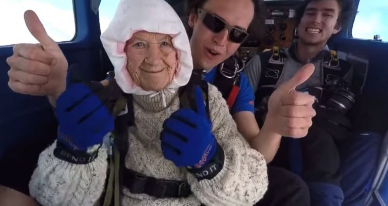 長期和老奶奶合作的SA跳傘公司表示,住在澳洲阿勒斯通(Athelstone)的奧西亞(Irene O’Shea)在慶祝一百歲生日時第一次嘗試跳傘,從此之後她每年生日都會跳傘。