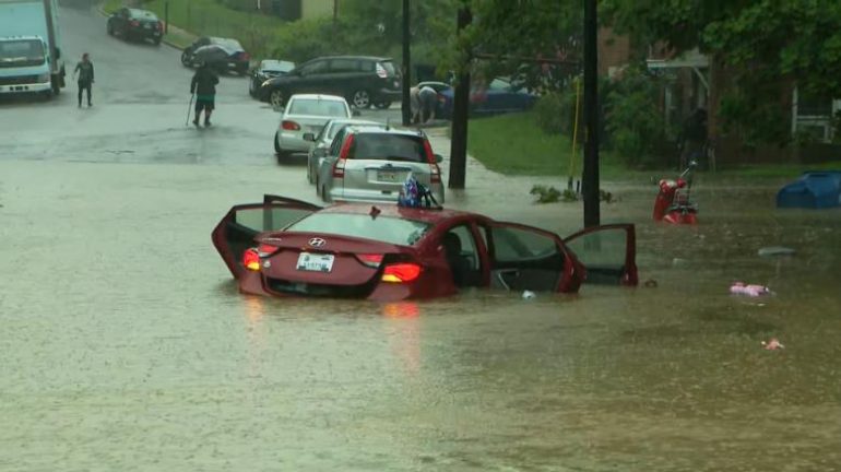 週一上午 9 點至 10 點間,華府(Washington D.C.)在短短一小時內就降下了將近一個月的雨量,導致交通中斷及嚴重淹水,連國家氣象局都把這場風暴列為是百年難得一見的豪雨。