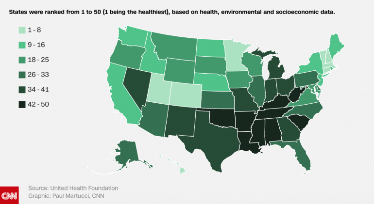 全美國最健康的州依序分別為夏威夷、麻州、康乃狄克州、佛蒙特州和猶他州。而健康狀況最差的州,則是阿肯薩斯州、奧克拉荷馬州、阿拉巴馬州、密西西比州和路易斯安那州。而紐約排名第10,加州排名第12。