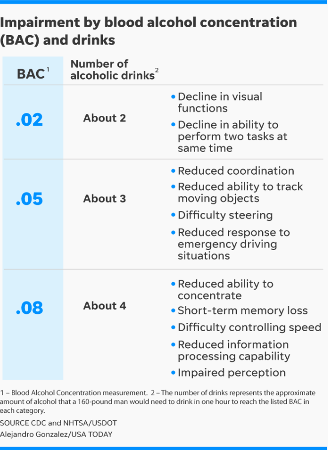 根據美國疾病管制與預防心中(CDC)和美國國家公路交通安全管理局(NHTSA)所做的研究指出,駕駛的駕駛技巧在血液酒精濃度達到0.02%時就已經開始減弱。而對一個重達160磅(=72公斤)的男生來說,要在一個小時內喝下三到四杯酒才會達到0.05%。