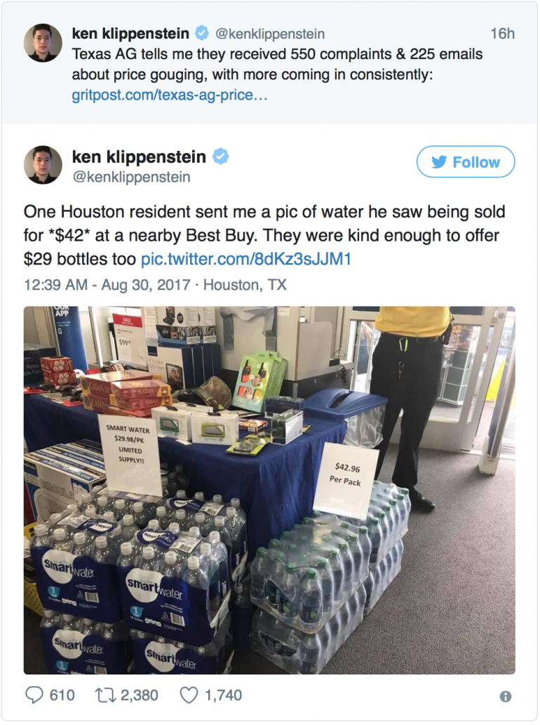 雖然Best Buy沒有參與,但自然災害之後,必須品的價格通常是一個問題。德州總檢察長辦公室告訴記者,自從哈維颶風摧毀了德州東南部後,這張照片已經收到了225封電子郵件和550份投訴。